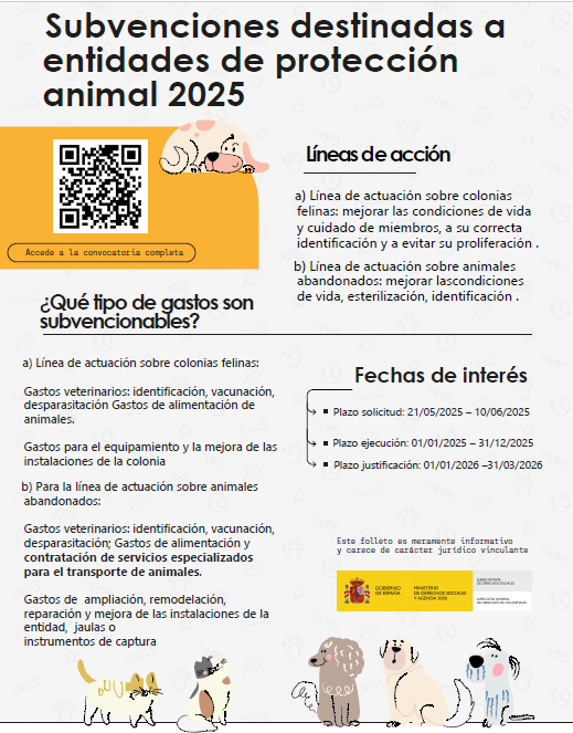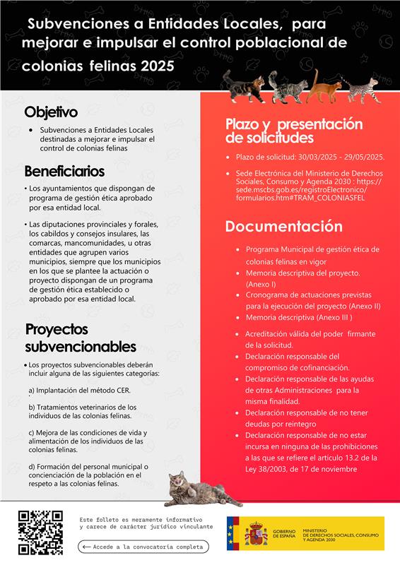 En España existen diferentes lÃneas de subvención destinadas a la gestión ética de colonias felinas. A nivel estatal, el Ministerio de Derechos Sociales, Consumo y Agenda 2030 lanza cada año ayudas especÃficas tanto para entidades locales (ayuntamientos, diputaciones, cabildos, mancomunidades) como para entidades de Protección animal (asociaciones).
